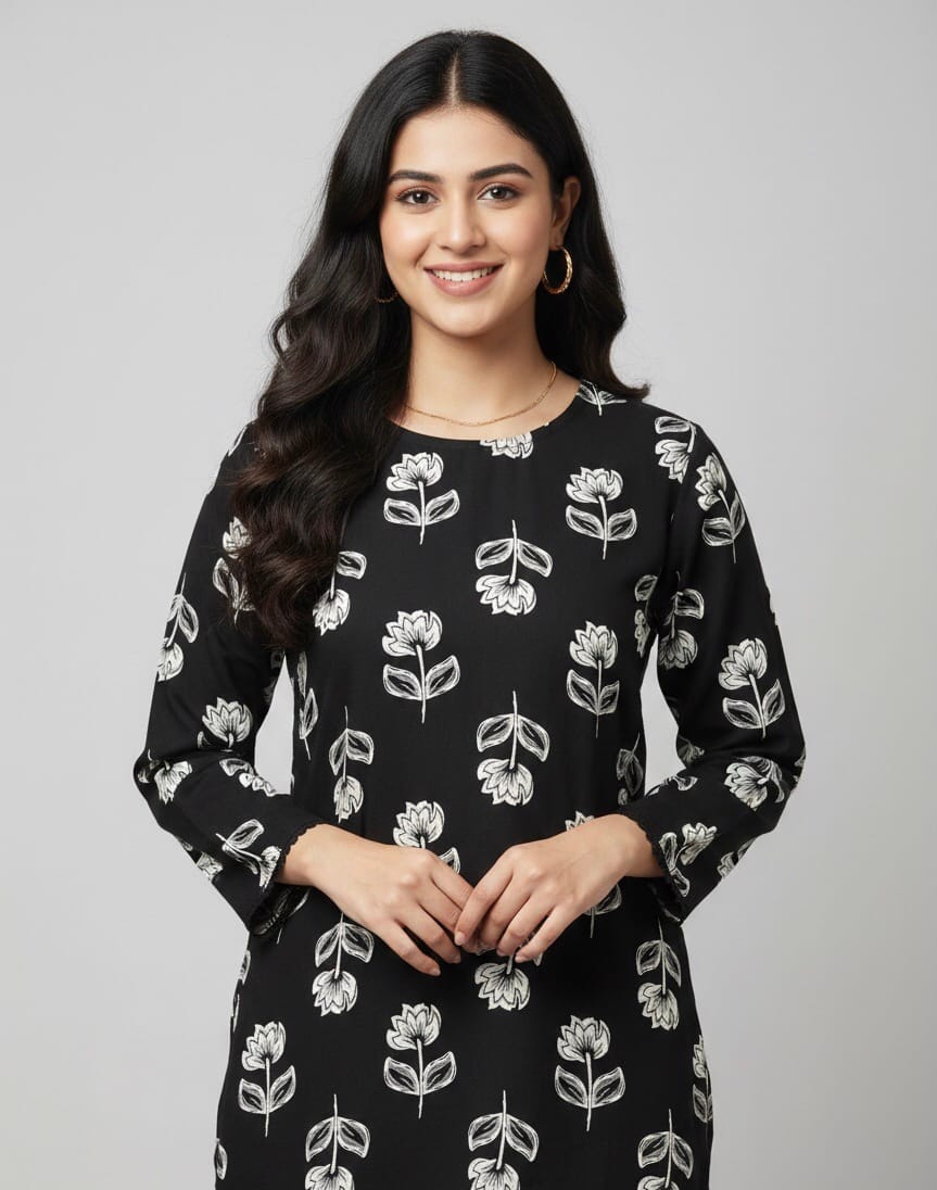 Black And Bloom Flower Print Short Kurti from our short-kurtis collection in Sri Lanka. 26″ – 32″ inches combines modern style with lasting quality, perfect for daily wear. Black And Bloom Flower Print Short Kurti Perfect for women seeking both style and comfort in Sri Lanka. Black And Bloom Flower Print Short Kurti Ideal for parties, casual outings, and special occasions. Black And Bloom Flower Print Short Kurti Available in multiple sizes and patterns to suit every taste.