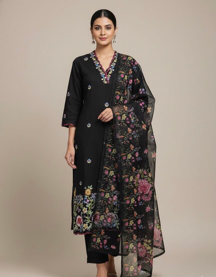 Black Mul Chanderi Kurti Set With Floral Organza Duppatta from our party-wear-kurtis collection in Sri Lanka. 50″ inches length combines modern style with lasting quality, perfect for daily wear. Black Mul Chanderi Kurti Set With Floral Organza Duppatta This collection ensures versatility and premium quality. Black Mul Chanderi Kurti Set With Floral Organza Duppatta Ideal for parties, casual outings, and special occasions. Black Mul Chanderi Kurti Set With Floral Organza Duppatta Ideal for parties, casual outings, and special occasions.