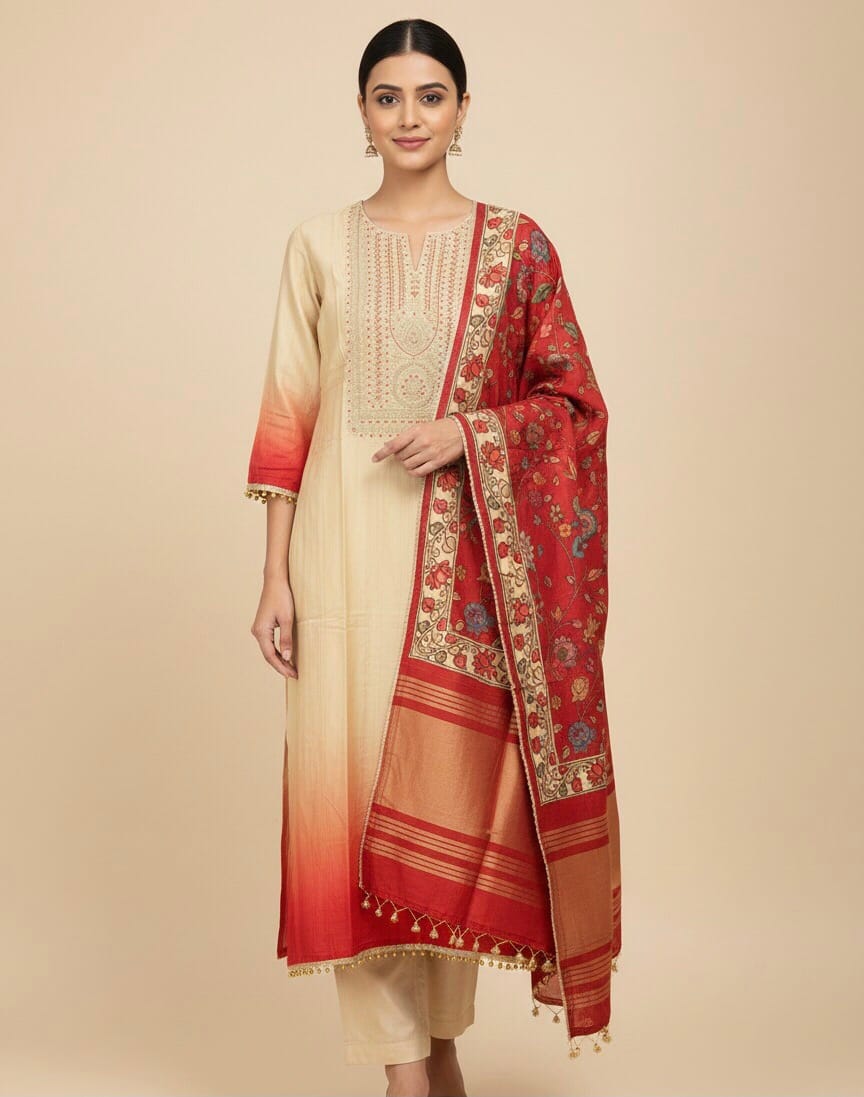 Cream Chanderi Silk Kurti Set With Kalamkari Duppatta from our party-wear-kurtis collection in Sri Lanka. 50″ inches length provides a stylish look while keeping comfort in mind. Cream Chanderi Silk Kurti Set With Kalamkari Duppatta This collection ensures versatility and premium quality. Cream Chanderi Silk Kurti Set With Kalamkari Duppatta Ideal for parties, casual outings, and special occasions. Cream Chanderi Silk Kurti Set With Kalamkari Duppatta Ideal for parties, casual outings, and special occasions.