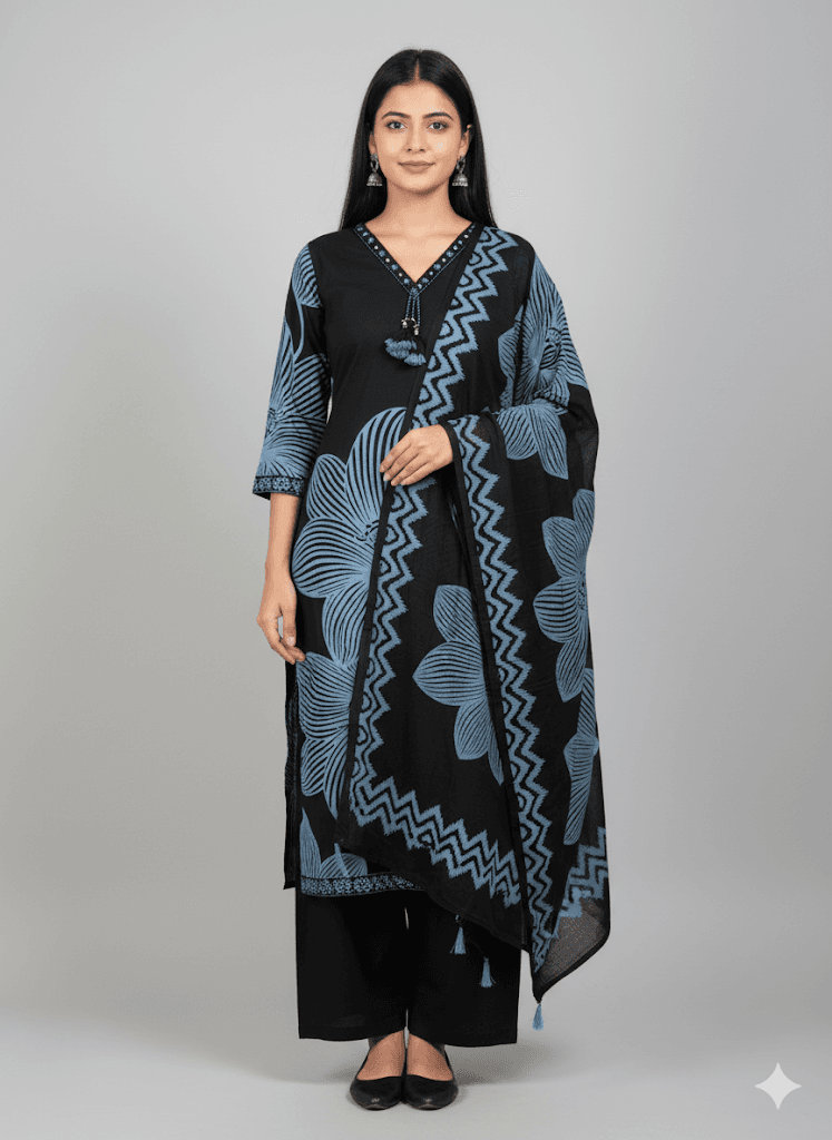 Navy Bloom Cotton Ensemble Set Kurti from our party-wear-kurtis collection in Sri Lanka. 50″ inches length provides a stylish look while keeping comfort in mind. Navy Bloom Cotton Ensemble Set Kurti Available in multiple sizes and patterns to suit every taste. Navy Bloom Cotton Ensemble Set Kurti Ideal for parties, casual outings, and special occasions. Navy Bloom Cotton Ensemble Set Kurti Ideal for parties, casual outings, and special occasions.