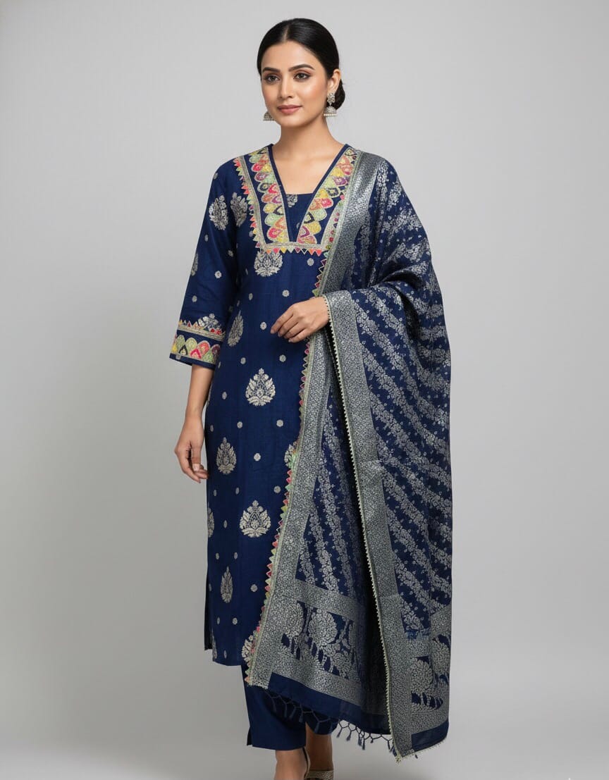 Navy Blue Jacquard Silk Kurti Set from our party-wear-kurtis collection in Sri Lanka. 50″ inches length is crafted with high-quality materials to ensure comfort and style. Navy Blue Jacquard Silk Kurti Set Available in multiple sizes and patterns to suit every taste. Navy Blue Jacquard Silk Kurti Set Ideal for parties, casual outings, and special occasions. Navy Blue Jacquard Silk Kurti Set Available in multiple sizes and patterns to suit every taste.
