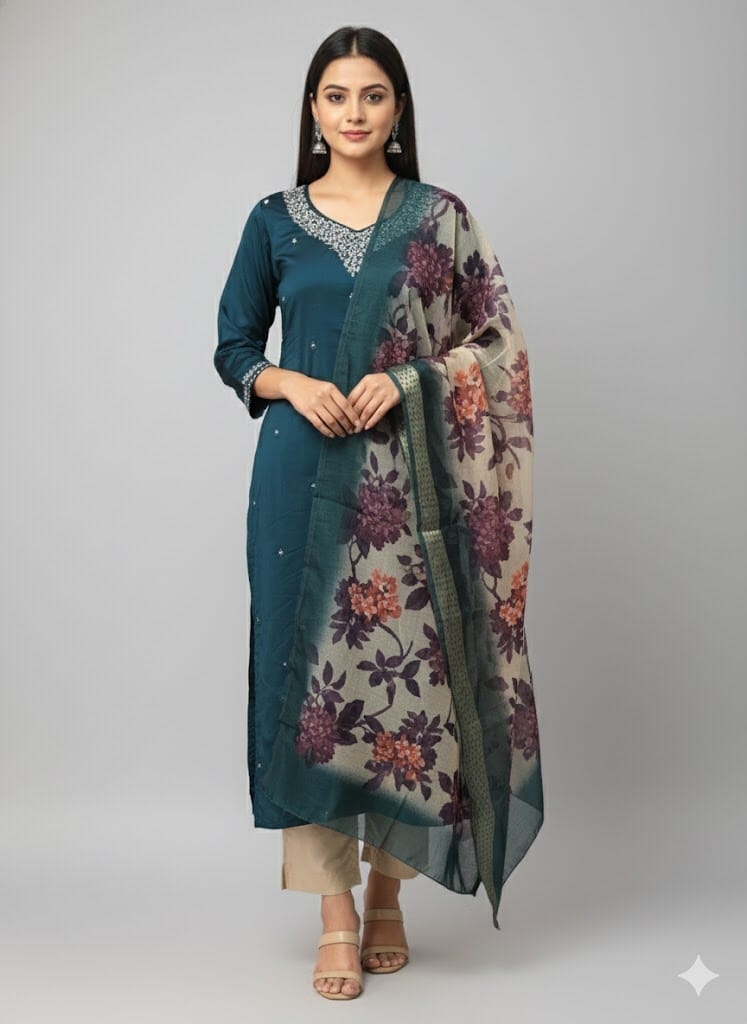 Peacock Green Kurti Set With Floral Print Shawl from our party-wear-kurtis collection in Sri Lanka. 50″ inches length provides a stylish look while keeping comfort in mind. Peacock Green Kurti Set With Floral Print Shawl This collection ensures versatility and premium quality. Peacock Green Kurti Set With Floral Print Shawl Available in multiple sizes and patterns to suit every taste. Peacock Green Kurti Set With Floral Print Shawl This collection ensures versatility and premium quality.